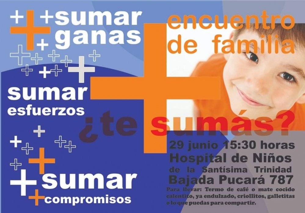 jueves, 27 de junio de 2019 Sumamos ganas, sumamos esfuerzos, sumamos compromisos... Te esperamos el sábado 29 de junio a las 15.30 hs en la puerta del Hospital de Niños de la Santísima Trinidad, Bajada Pucará